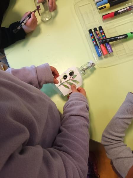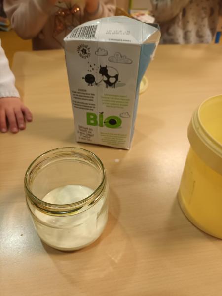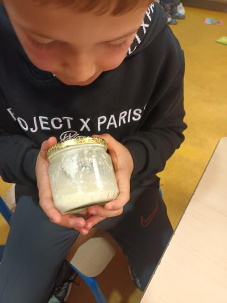Nous avons fabriqué du beurre et peint des petites bouteilles d'huile que l'on offrira aux familles qui ont participé à la cueillette des olives au mois de Novembre.